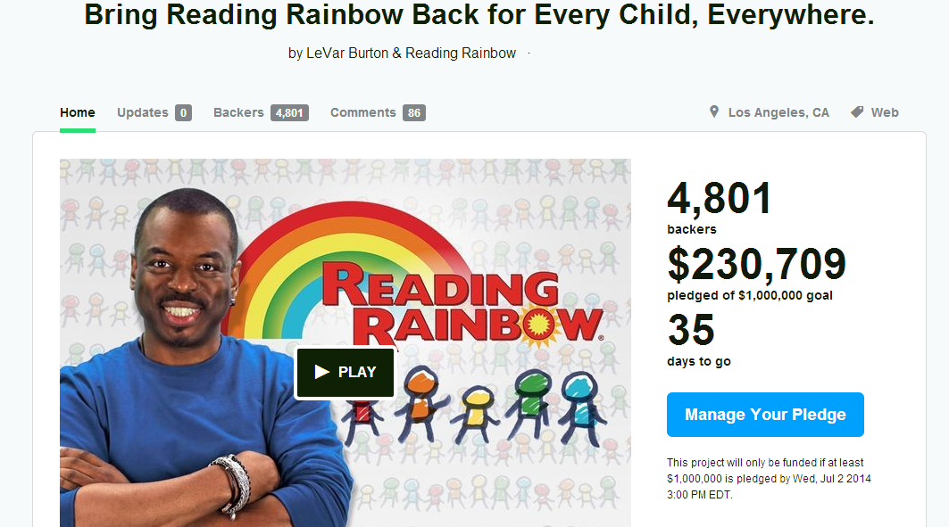 Update #3: The Reading Rainbow Kickstarter, at 13 hours, has hit the 1.2 million dollar mark. They have 34 more days until they close their donation campaign.